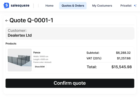 See how pricing updates instantly as customers customize, and quotes land in their inbox automatically.