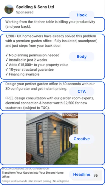 Mathew’s ad says: “1,200+ UK homeowners have already solved this problem with a premium garden office – fully insulated, soundproof, and just steps from your back door.”