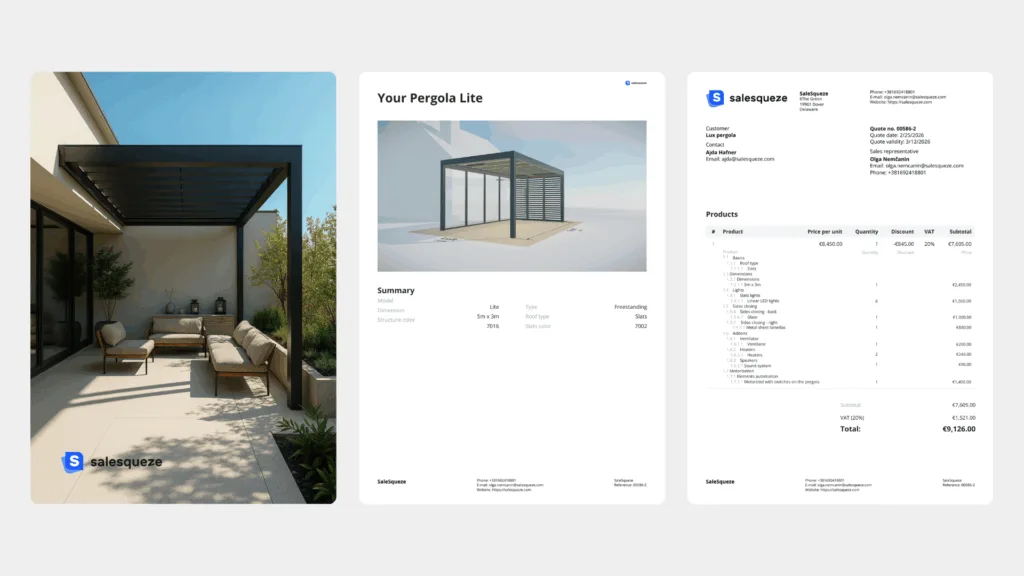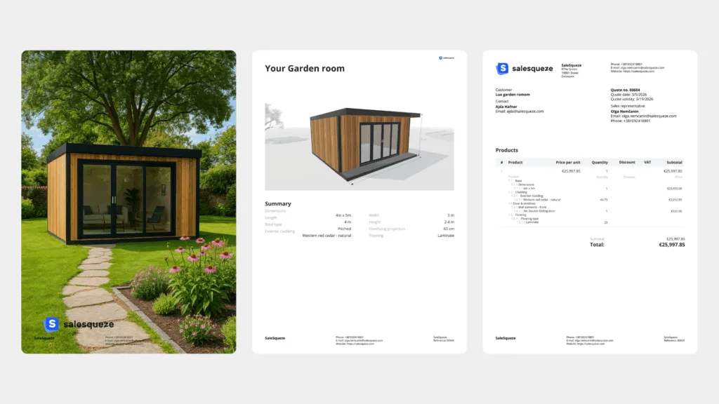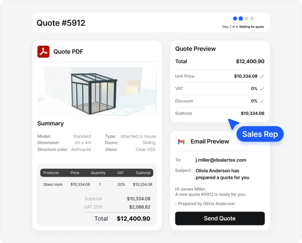 Someone designs their product in your 3D configurator. They click “Get Quote.” Within 60 seconds, they receive a professional PDF quote via email containing their exact configuration, a 3D image of what they designed, a detailed pricing breakdown, your company information, and clear next steps to move forward.