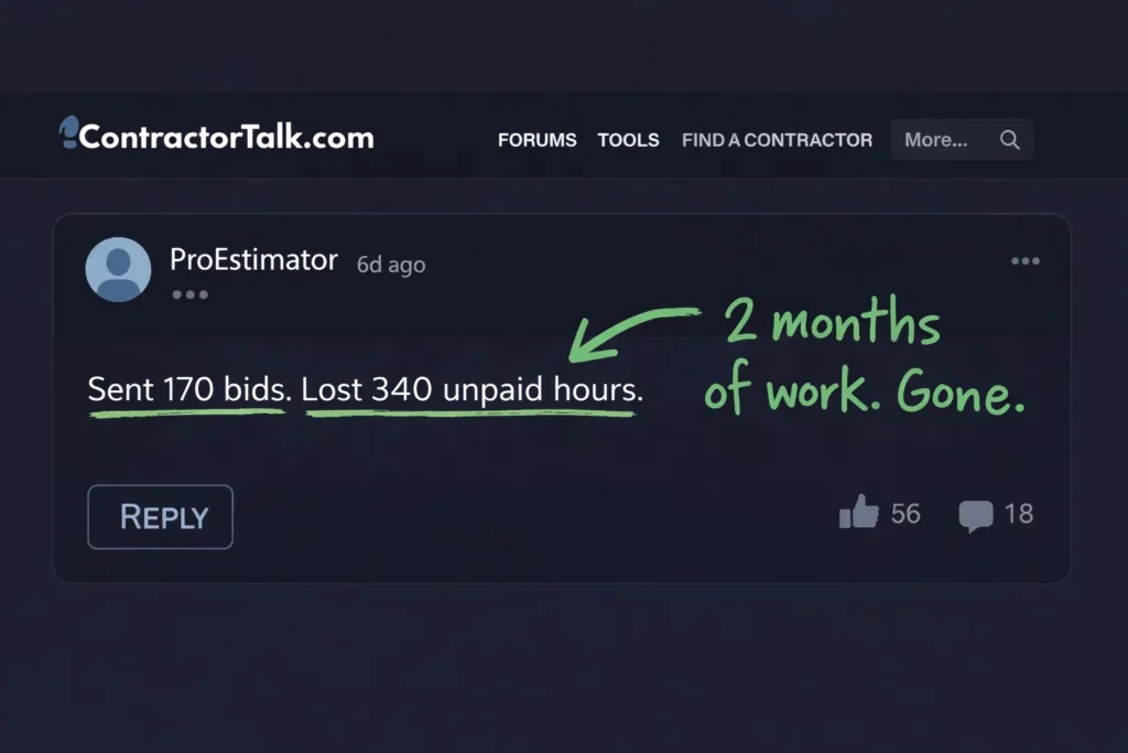 A contractor on ContractorTalk tracked something most of us are too busy to measure. In 2023, he sent out 170 bids. The process ate 340 hours of unpaid time. Two hours per bid—drive to the site, measure, discuss options, build the quote, send it, follow up.