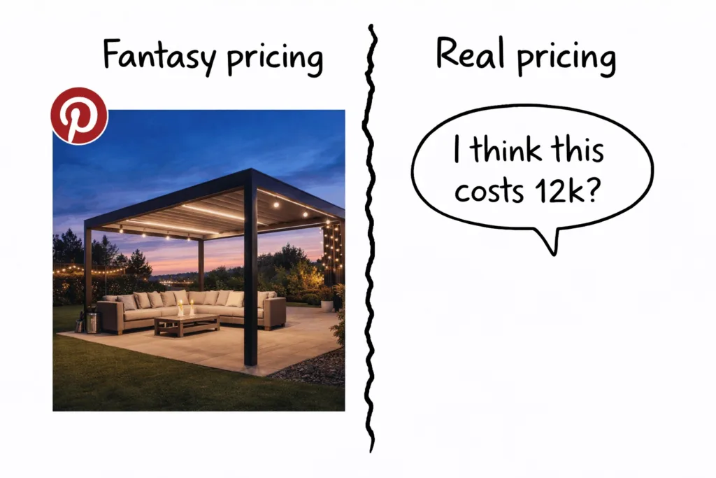 They’re scrolling Pinterest and see a stunning pergola with motorized louvers and integrated lighting. The post doesn’t mention it cost $45,000. They save it, show their spouse, decide they want one, and start searching for quotes anchored to… nothing. Just a feeling. They see the $40,000 pergola and think $12,000 sounds right.