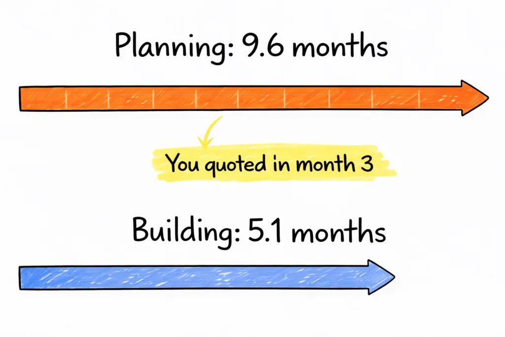 Here’s the part that kills me. Houzz data showed planning takes twice as long as building. Kitchen renovations averaged 9.6 months of planning and 5.1 months of construction.